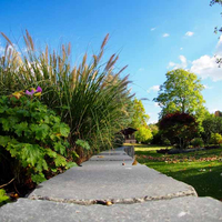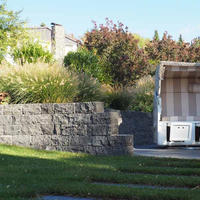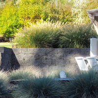 Ausführung einer Gartenanlage mit Basalt-Mauersteinen (Produktvorschlag ähnlich) sowie Bodenplatten aus Basanit G684.