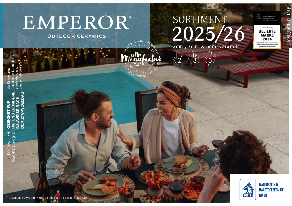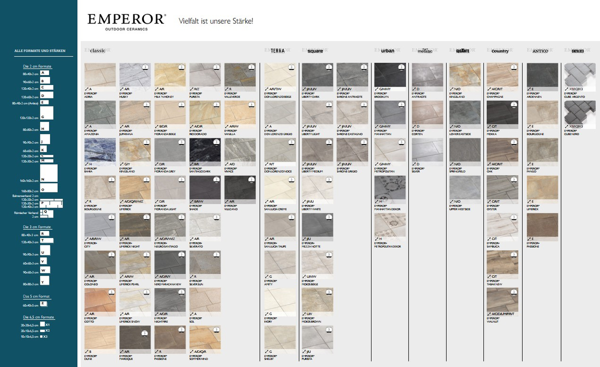 Das Geheimnis von EMPEROR® Terrassenplatten liegt in der Verarbeitung. Hochwertiger und frostfester Beton wird dauerhaft mit den auf Maß gefertigten EMPEROR® Werkstücken verklebt. Ein weiteres Charakteristikum von EMPEROR® ist die scheinbar unerschöpfliche Formatvielfalt: von klassischen, rechteckigen Natursteinformaten bis hin zu quadratischen Großformaten ist alles dabei. Darüber hinaus werden EMPEROR® Platten in zwei verschiedenen Stärken hergestellt – 2 cm und 3 cm, um damit allen technischen Anforderungen gerecht zu werden. Die 3-cm-Outdoor-Keramik ermöglicht das lose Verlegen in Ihrem Garten und wird nun durch die Serie EMPEROR® AiO (All in One) ergänzt, die durch einen aufgesetzten Betonkern sogar eine Befahrbarkeit der Fliesen zulässt.