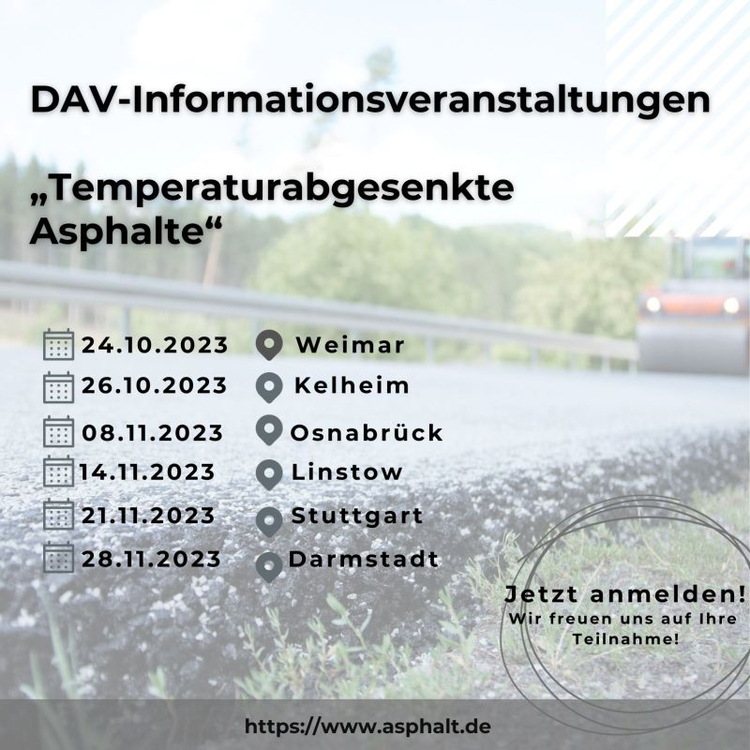 Die Einführung temperaturabgesenkter Asphalte als Regelbauweise zur Reduzierung von Dämpfen und Aerosolen im Umgang mit Heißbitumen nimmt immer konkretere Züge an. Gleichzeitig wird die Zeit immer knapper und nicht jeder Asphalthersteller bzw. -verarbeiter, nicht jeder Auftraggeber und jedes Ingenieurbüro hat(te bislang) Zugang zu Teststrecken, um bereits eigene Erfahrungen zu sammeln. Nehmen Sie daher bitte unbedingt die Gelegenheit wahr, sich im Rahmen der Informationsveranstaltungen des Deutschen Asphalt Verbandes einen breit gefächerten Überblick über anstehende Regelwerksänderungen, die derzeitigen technischen Möglichkeiten und den Erfahrungshorizont damit zu verschaffen.